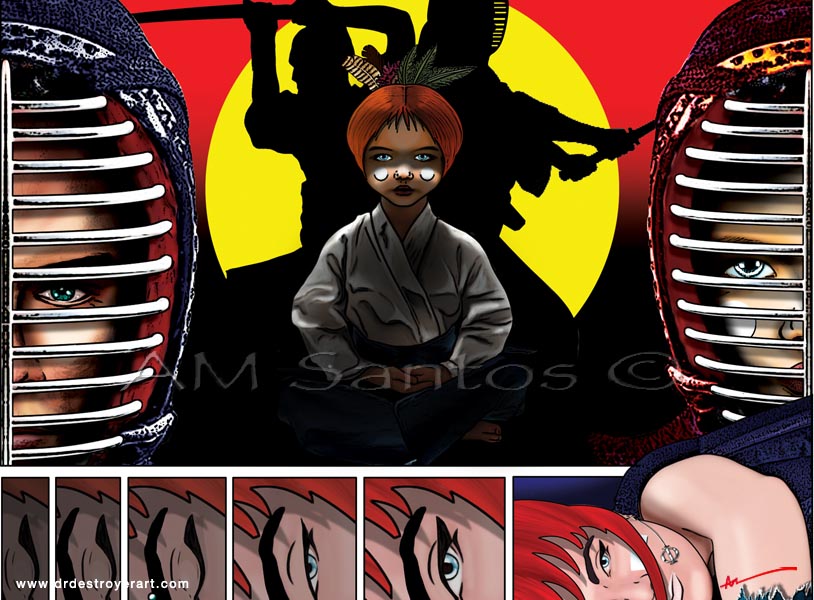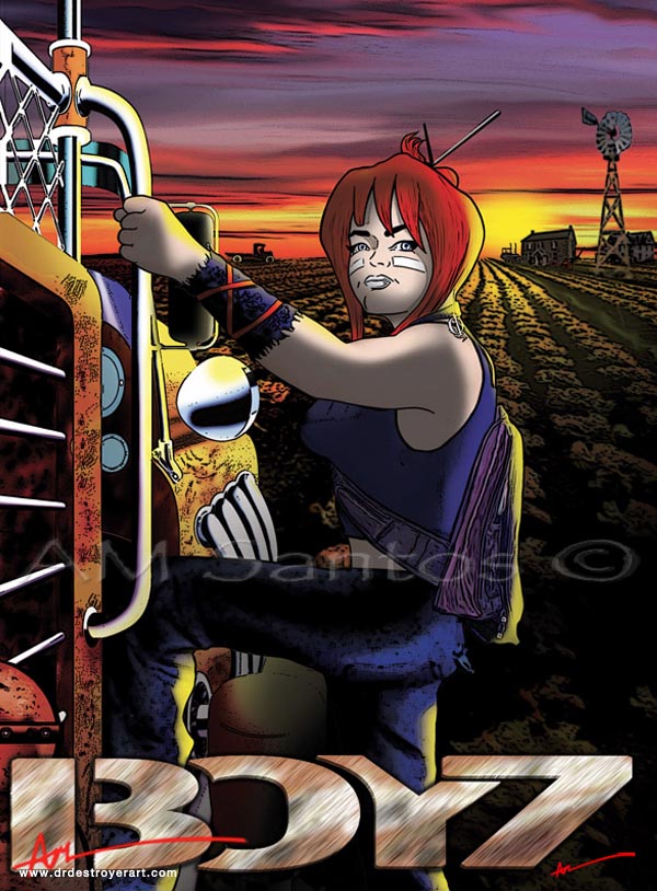 Cover for a unfinished graphic novel. Her name is Boy7, her name came for the fact she was the seventh child and girl, for her older brothers all died in the great flare and the few that survived… All has changed, Life, customs, beleves and technology, thanks to the open of eyes all was reveilled…
